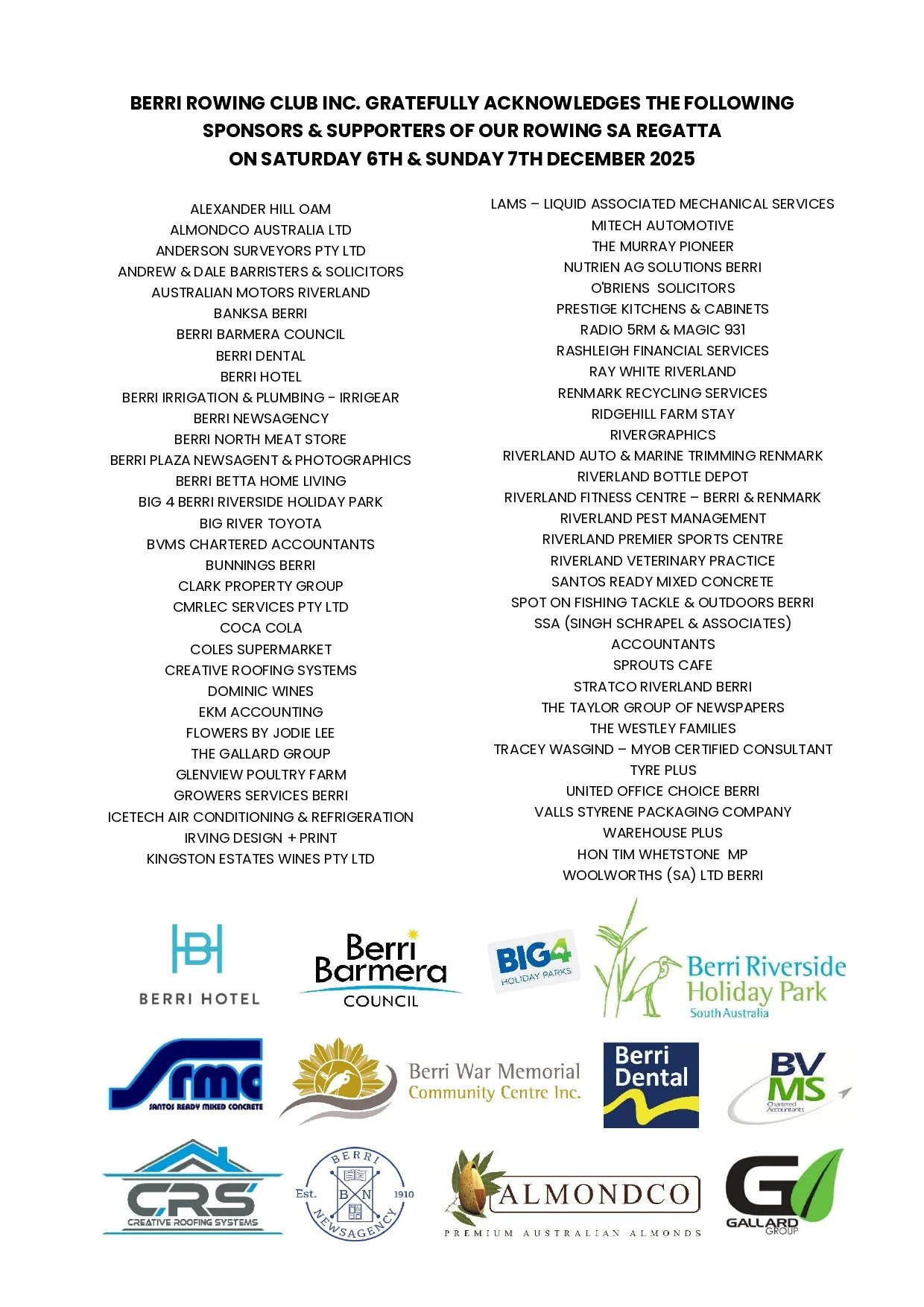 The Riverland Regatta & 2nd Grade State Championships, run by Rowing SA, is hosted biennally by the Berri Rowing Club, with alternate years held at the Renmark Rowing Club.